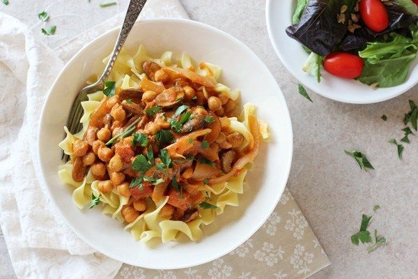This vegetarian take on a hearty Hungarian dish uses chickpeas and mushrooms to give it protein and a "meaty" texture