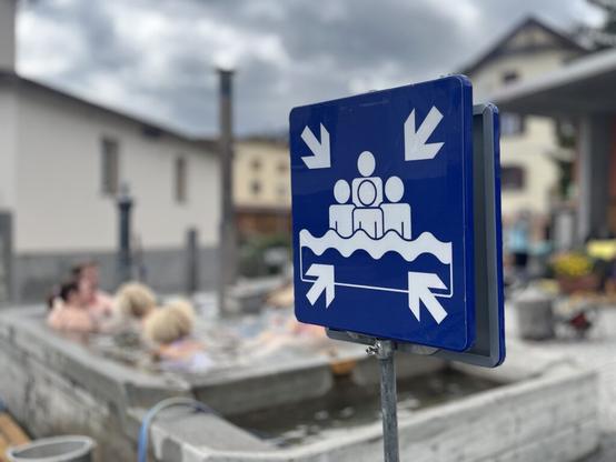 Mir sind ziemlich viele SBB-Schilder geläufig: Quadratisch, blau, mit weissen Piktogrammen zeigen sie meist sehr klar an, worum es geht. Ein etwas spezielles solches Schild entdeckten wir, als wir mal wieder den Rundkurs Scuol – Motta Naluns – Prui – Ftan mit der Postautofahrt zurück nach Scuol vollenden wollten: Mitten auf dem Dorfplatz stand es. Darauf abgebildet: vier diagonale Pfeile, vier stilisierte Menschen, die in einem ebenfalls stilisierten Brunnen stehen oder sitzen.
