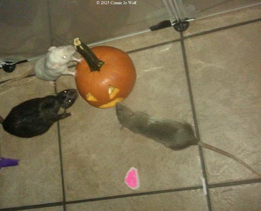 Flora, Ghost, and Pumpkin got a carved pie pumpkin during playtime on Halloween 2025.