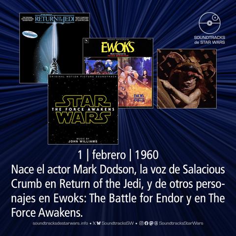El 1 de febrero de 1960 nace el actor Mark Dodson, la voz de Salacious Crumb en Return of the Jedi, y de otros personajes en Ewoks: The Battle for Endor y en The Force Awakens.