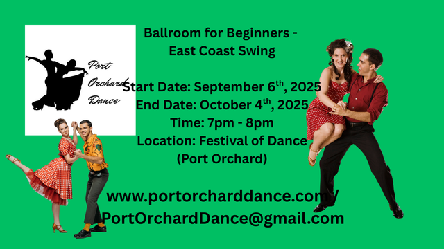End the summer on the right foot! 5 weeks of beginner Salsa and East Coast Swing will be offered starting August 2024 in Bremerton and Port Orchard! Only $75/person for all 5 weeks of instruction; no partner or prior experience required!