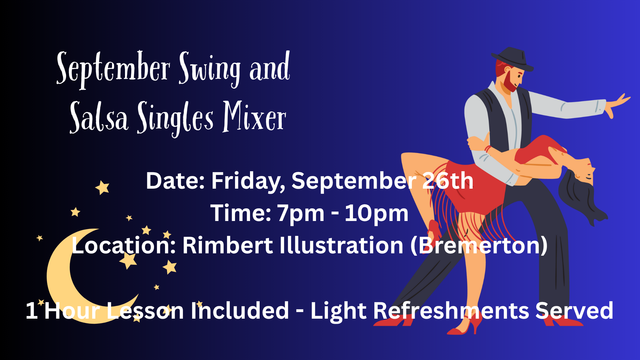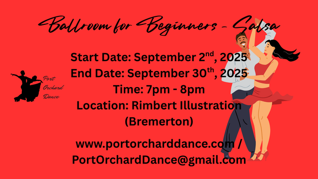 Starting August 13th is 5 weeks of beginner Swing at Rimbert Illustration in Bremerton. Starting August 17th is 5 weeks of beginner Salsa in Port Orchard! Only $75/person for all five weeks! No partner or prior experience is required! Pre-registration is strongly encouraged!