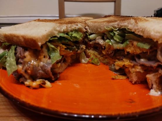 Tortilla chips are crisps, right? Obviously yes. I made beef nachos, and put them in a sandwich with spring onions and shredded lettuce. The bread was a homemade sandwich loaf, lightly toasted. Spread with a spicy zingy mayo, that I made with lime juice, garlic, chilli, cumin, salt and a decent amount of black pepper.