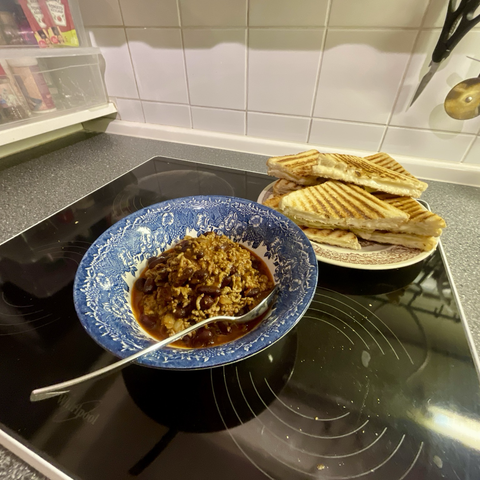 Tortilla chips are crisps, right? Obviously yes. I made beef nachos, and put them in a sandwich with spring onions and shredded lettuce. The bread was a homemade sandwich loaf, lightly toasted. Spread with a spicy zingy mayo, that I made with lime juice, garlic, chilli, cumin, salt and a decent amount of black pepper.