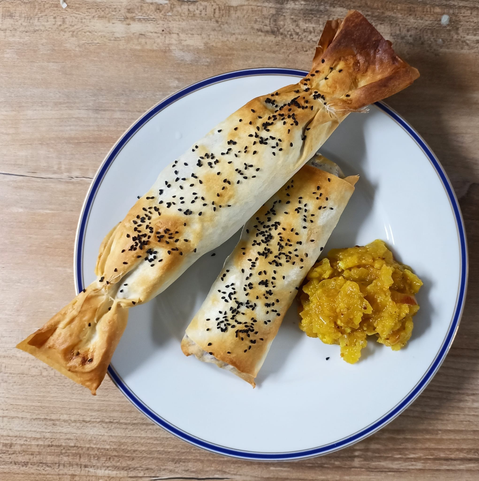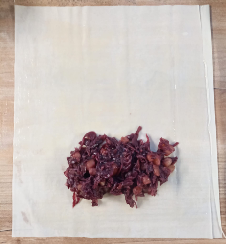 #Filoteig mit Butter einstreichen, Rotkohl darauf verteilen + aufrollen. Mit Sahne bepinseln, mit #Schwarzkümmel bestreuen + backen.