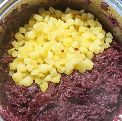 #Kartoffel würfeln, kochen. #Rotkohl (Glas) mit #Preiselbeer.marmelade #Apfelessig #Kardamom #Piment #Portwein kochen, bis die Flüssigkeit verdampft ist. Kartoffel zugeben.