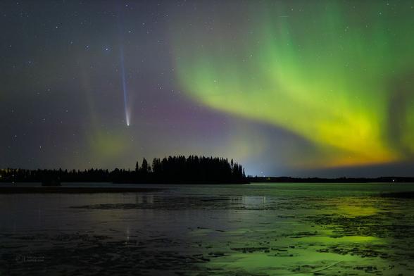 Another fabulous shot of Comet C/2025 A6 (Lemmon) over Suotojärvi Lake, Sweden, by Petr Horálek, with the colorful Aurora Borealis lighting up the sky.