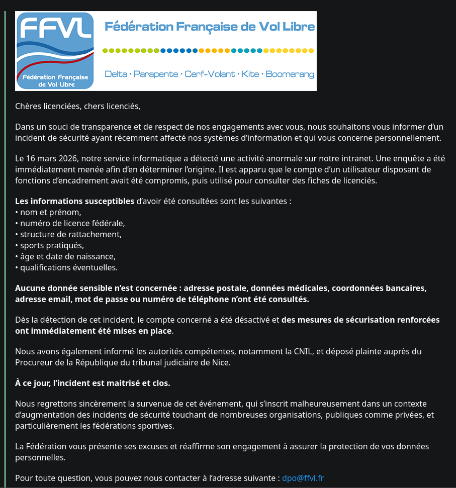 La bibliothèque Python LiteLLM, servant à d’interface unifiée pour plus de 100 services de LLM de différents éditeurs, très populaire (3,4 millions de téléchargements par jour), a été compromise 2 fois pour un groupe de pirates, pendant quelques heures le 24 mars. La charge utile aspire tout ce que contiennent les machines hôtes (notamment les secrets : clefs SSH, mots de passe, credentials, tokens, etc) et installe une porte dérobée persistante : https://www.numerama.com/cyberguerre/2217675-cinq-jours-pour-infiltrer-trois-heures-pour-tout-voler-comment-des-hackers-ont-piege-des-millions-de-developpeurs-ia.html