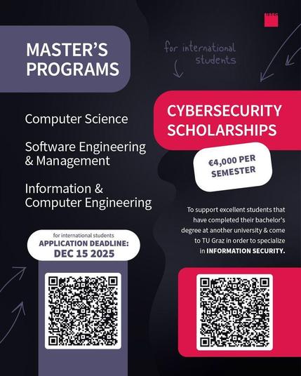 Specialise in Cybersecurity with the Master’s programs and kickstart your academic journey at TU Graz with the ‘Cybersecurity Scholarship’ (€4,000/semester) for international students! 🌍✨