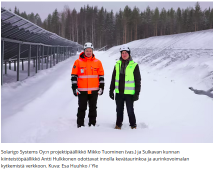 "Eteläsavolainen Sulkava aikoo olla Suomen ensimmäinen kunta, joka kattaa sähkönkulutuksensa aurinkovoimalla ... Auringosta saadaan toistaiseksi minimaalinen osa Suomen sähköstä, mutta suunta on kääntymässä. Sulkavan aurinkovoimalan on määrä tuottaa sähköä vuosittain yli tuplasti kunnan kulutuksen verran."