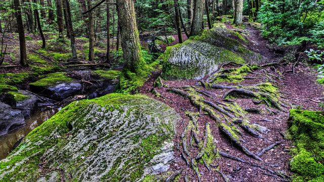 Mossy, rocky stream banks, Mad River ravine, Wolcott, Connecticut. August 2, 2020, 7:20 PM.
