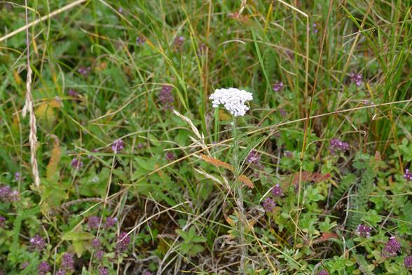 White yarrow (Achillea millefolium, Gemeine Schafgarbe) surrounded by low clusters of wild thyme (Thymus serpyllum, Sand-Thymian) and various green grasses in a steep and sunny part of our meadow. Foto by Laner Sepp.
