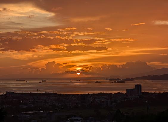 Sunset over Port of Spain, Trinidad. The reflection of the sunset colours in the sea are gorgeous. The hazy hills to the right in the far background are Venezuela.
