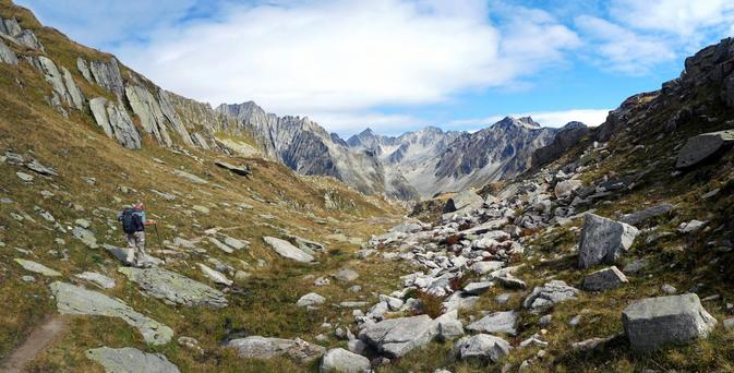 Das Foto, das aus zwei zusammengefügten Bildern besteht, entstand beim Abstieg von der Pörtlilücke zur Etzlihütte.