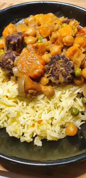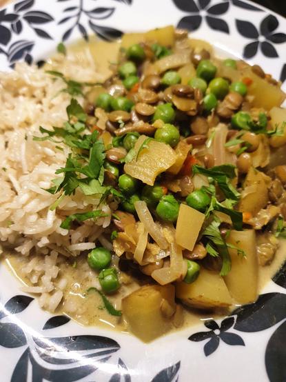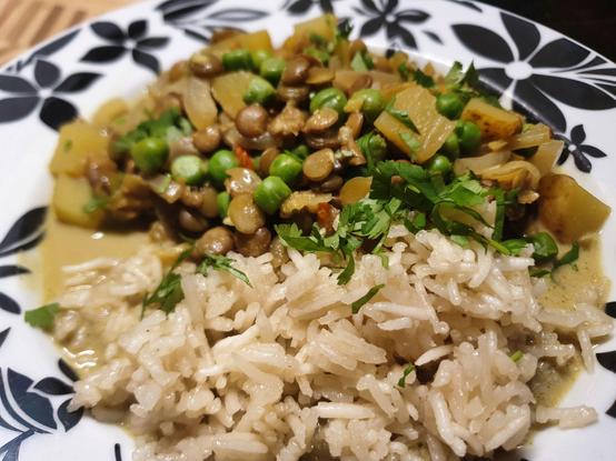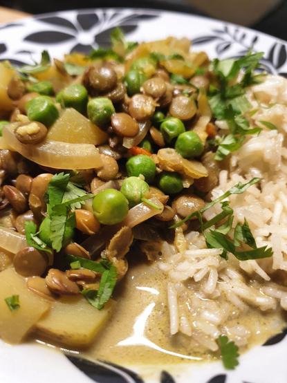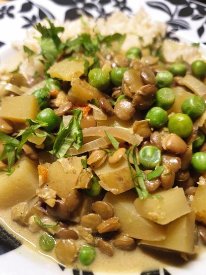 Green Lentil, Peas & Potato curry, served w/ Basmati rice. Topped w/ fresh coriander.