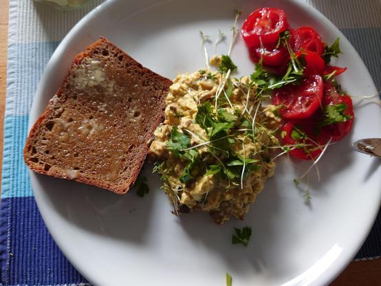 Scrambled Tofu (plain & smoked) with mushrooms, tomatoes and homemade bread, sprinkled with parsley and cress. 😋
