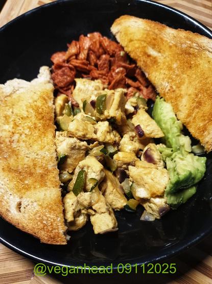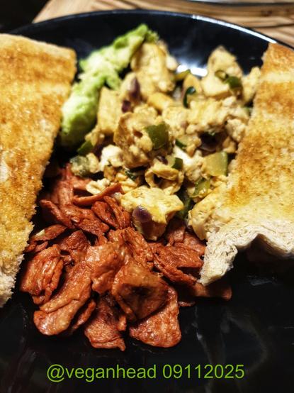 Scrambled Tofu (w\ red onion, green pepper, courgette),'Vegobacon' Klippta Skivor Vegansk, Fresh Avocado, Toasted Bread