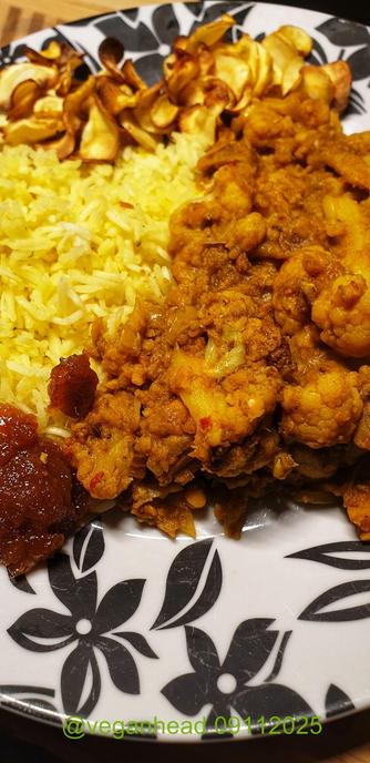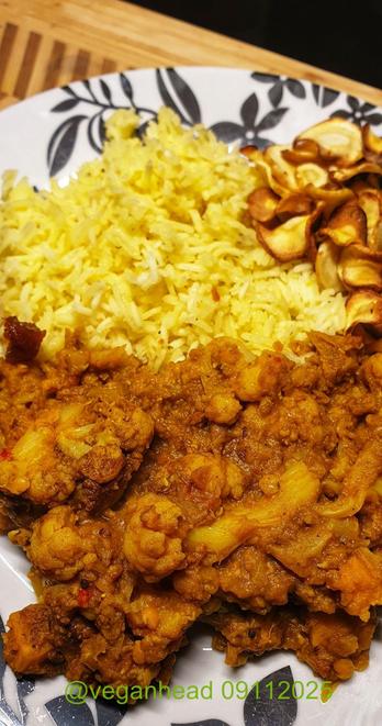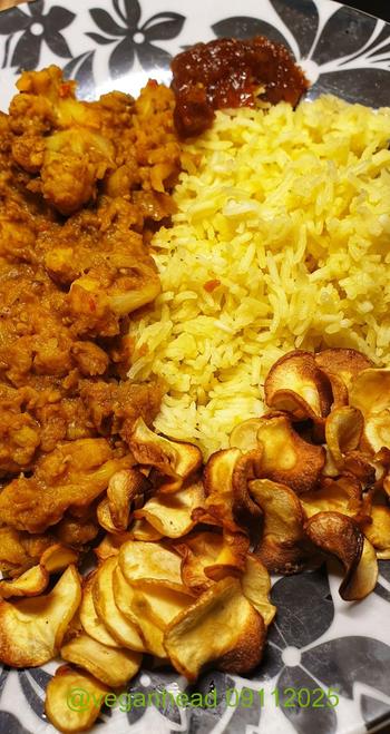 Cauliflower and Red Lentil Madras, Basmati Rice, Air-fried Parsnip Crisps. Served w/ Mango Chutney.