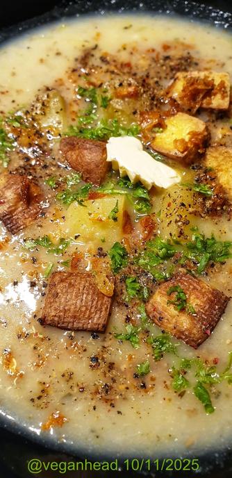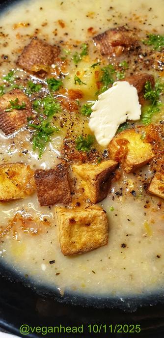 Creamy Leek & Potato Soup, served w/ air-fried tofu, crispy fried onions. Topped w/ ground fyra peppar, fresh parsley, & a dab of margarine.