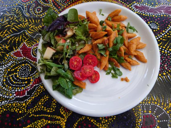 Pumpkin scissor pasta roasted with garlic, chili and sage, strewn with parsley along with a salad and tomatoes 😋