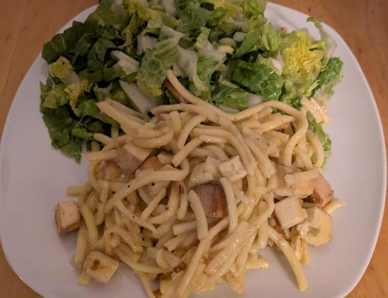 Gestern auf dem Teller: Käsespätzle mit Räuchertofu und Alibi Salat.