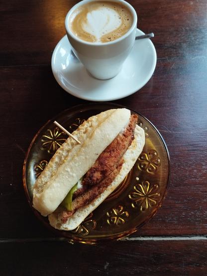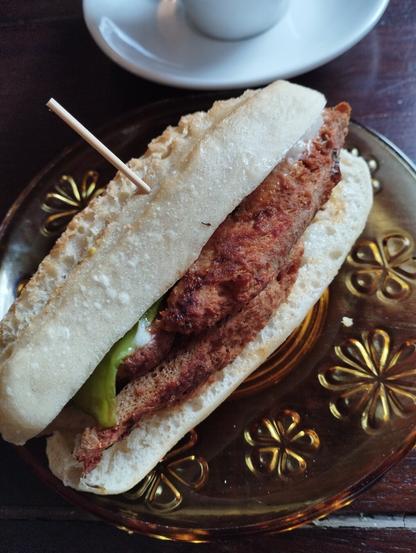 Pintxo de filetitos de soja, pimiento verde y veganesa. Café con leche vegetal. En el bar vegano La Madriguera de Bilbao. Riquísimo como todo lo que praparan.