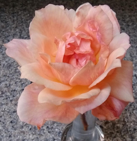 A bud, now opened, discovered while hacking back some overgrowth. M NL saved it from the trimmings and brought brightness into the house.