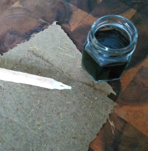Graspapier, eine Schreibfeder aus Birkenholz, Tinte vom Gemeinen Schopftintling.