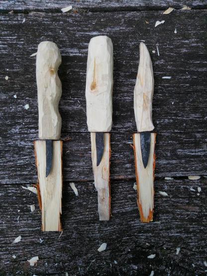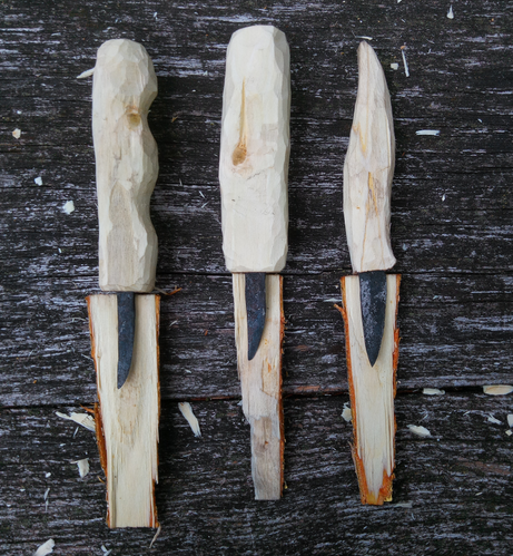 Sehr besonders war, dass ein Teilnehmy zum Schmiedekurs ein Schnitzmesser herstellte und am nächsten Tag zum Schnitzkurs mit diesem Messer schnitzte. Es ist das rechte auf dem ersten Bild.