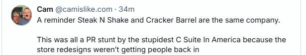 Cracker Barrel is where White Nationalists feel safe. It's also a hilarious self own "Hey look, a cracker next to a barrel!"