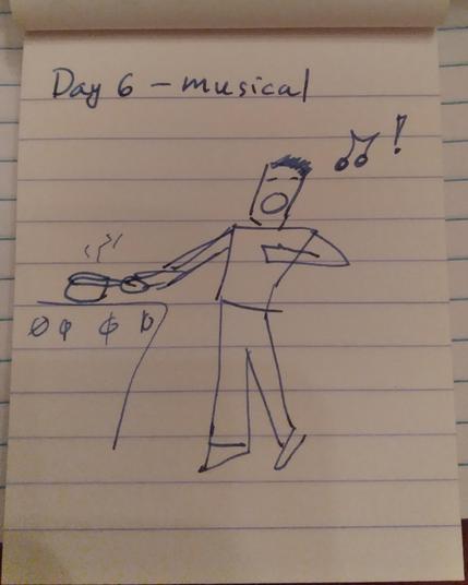 Day 6: musical/monster. Lucky the OC hits a sour note while making coffee (an attempt at horror). (No, really.)