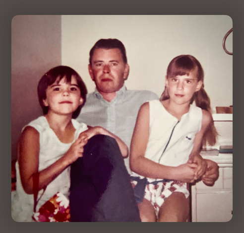 A young Bear at 9 years old with her sunburned Dad and adorable tanned younger sister. 😊