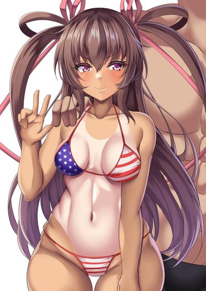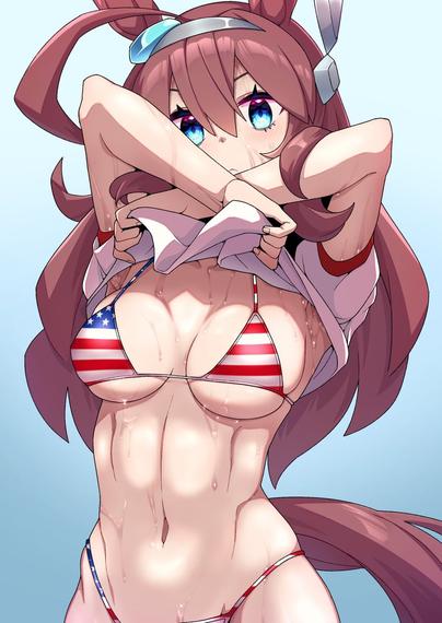 #1girl #ahoge #american_flag #american_flag_bikini #american_flag_print #animal_ears #bikini #blue_background #blue_eyes #breasts #brown_hair #clothes_lift #commentary_request #flag_print #flag_print_bikini #gradient_background #grey_hairband #hair_between_eyes #hairband #highres #horse_ears #horse_girl #horse_tail #long_hair #looking_at_viewer #medium_breasts #mihono_bourbon_(umamusume) #missile_(55missile) #navel #print_bikini #shirt #shirt_lift #solo #star_(symbol) #stomach #striped_bikini #striped_clothes #swimsuit #tail #umamusume #undressing #white_shirt https://danbooru.donmai.us/posts/7917537