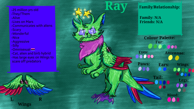 Here's da Alien guy. Next I'll do Gloomwing! Guys If u want any questions for Ray. Feel free to ask! -ONLY DOWNLOAD IF U WANNA DO FANART OF THEM- #originalcharacter #cat #cats #alien #birb #bird #weirdcreature #strangecreature #animalhybrid #hybrid #conceptart #green #blue #purple #pink #yellow #red #stars #animals #animal #omnisexual #sketchbook #fluffy #oc #refsheet