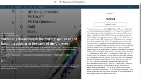 New Publication at the Open Journal of Astrophysics: "Witnessing downsizing in the making: quiescent and breathing galaxies at the dawn of the Universe" by Emiliano Merlin (Osservatorio Astronomico di Roma, Italy) and 20 others based in Italy, Germany, UK, USA, Switzerland, Spain and China