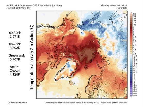 Octobre 2025 a été exceptionnellement chaud en #Arctique, notamment au Canada et dans la mer de Kara