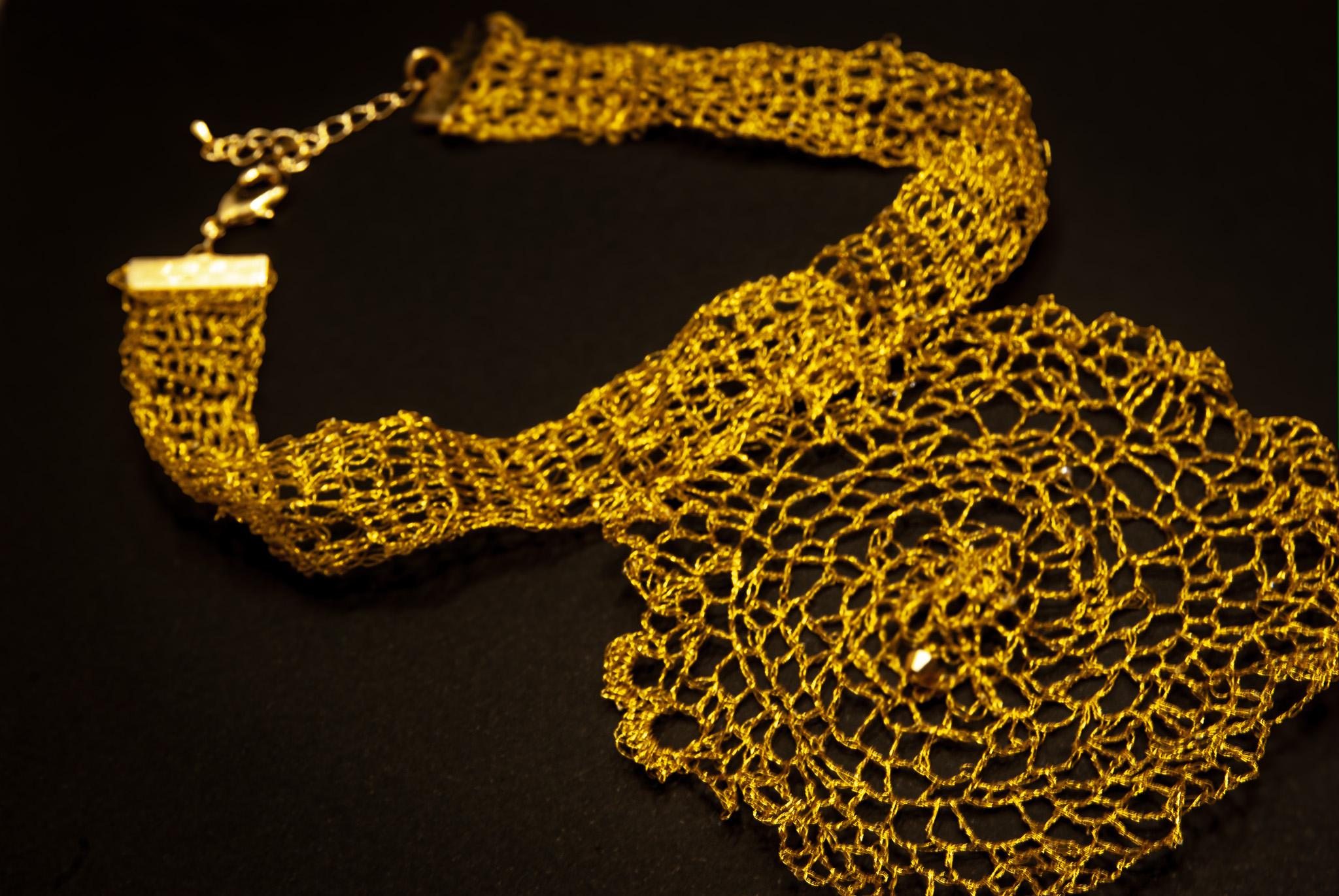 #CrochetArt #TextileArt #WearableArt #HandmadeJewelry #FiberArtist #GoldenThread #ContemporaryCraft #ArtJewelry #SlowMade #MythInspired