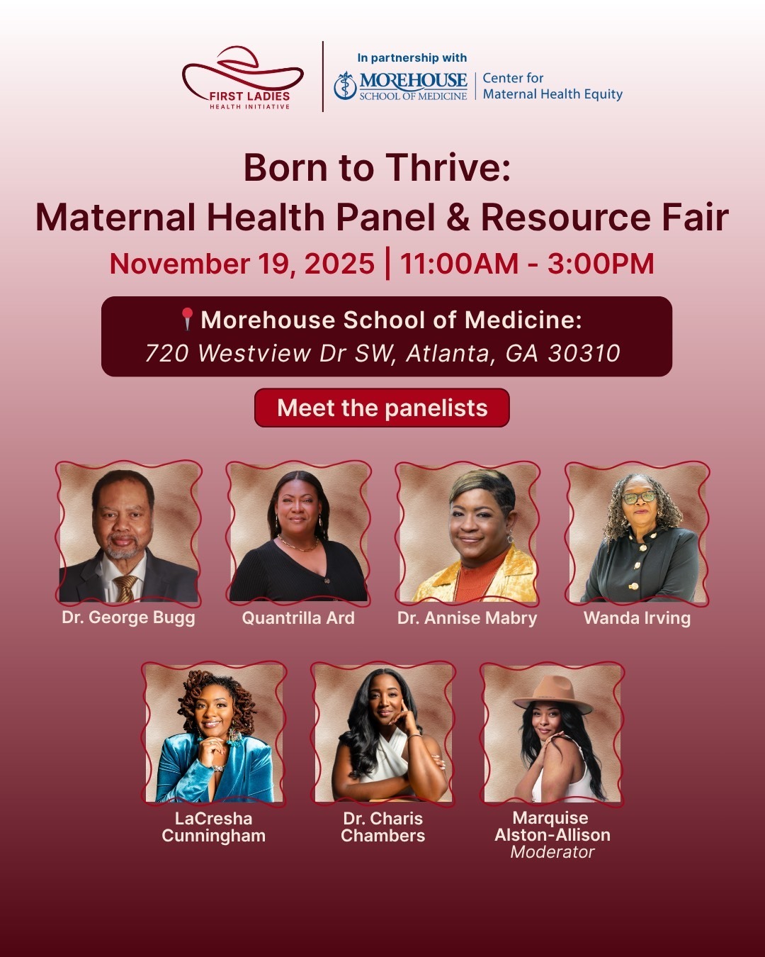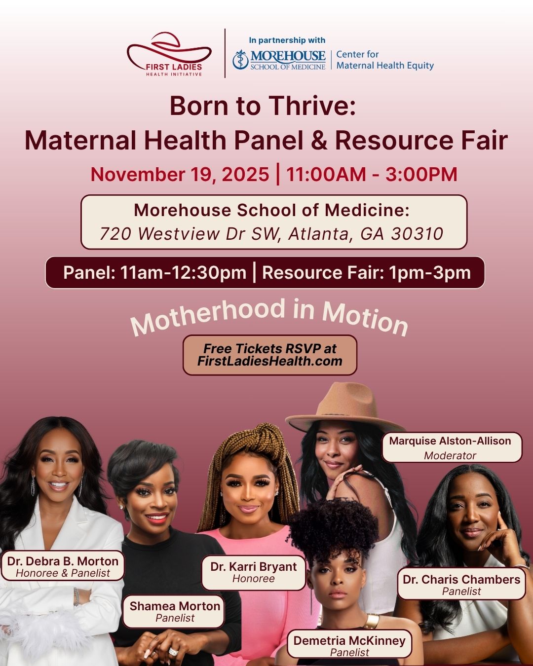 The First Ladies Health Initiative (FLHI) proudly announces Born to Thrive: Maternal Health Panel & Resource Fair, a transformative event uniting faith, family, and medicine. This event aims to advance maternal wellness. It will take place Wednesday, November 19, 2025, at Morehouse School of Medicine. This event is part of the First Ladies Health Initiative’s Maternal Health Tour. It is a national movement dedicated to improving maternal health outcomes through education, advocacy, and faith-based community engagement.