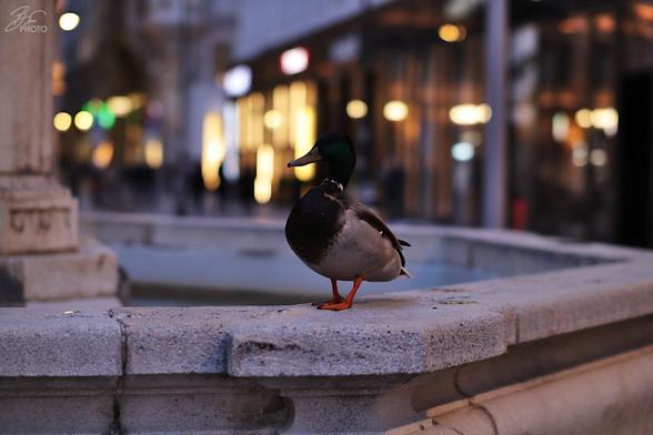 > Urban Duck, City Lights #photography #ttartisan #viennacity #grabenwien #urbanwildlife #eveningvibes #ducksofinstagram #cityanimals #wienliebe #fountainfriends #streetphotographyvienna #mallardmoment #austriaexplored #animalsincity #citywalks #twilighttones #urbanbeauty