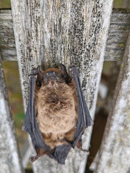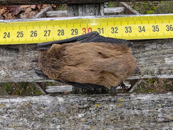 #Halloween. This bat is almost certainly the same one that was caught on our surveillance camera in July, as it was found in the room below the roof space around which it was flying in the summer. Unfortunately, while we were away, it must have fallen out of its crevice behind the roof beam and the wall, and onto the floor while we were away, and if it was not yet hibernating, couldn't find a way out again, so sadly did not survive. Some biologist friends of ours sent it to others more knowledgeable, but as yet still not definitively identified, although a suggestion of lesser noctule or the Leisler's bat has been made.