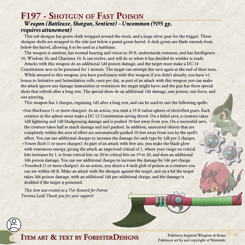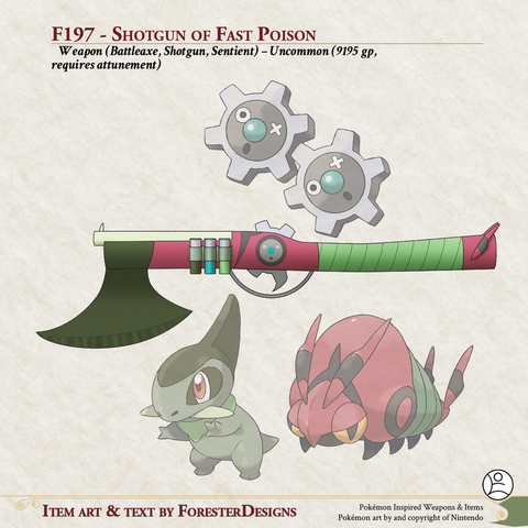 My #DnD #Pokemon #MagicItem of the Day, with a #fusion of #Axew, #Venipede, & #Klink for a #shotgun that doubles as a #battleaxe!