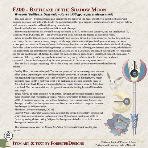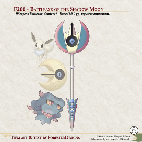 My #DnD #Pokemon #MagicItem of the Day, with a #battleaxe #fusion of #Eevee, #Lunatone, and #Misdreavus to cut like #moonlight!