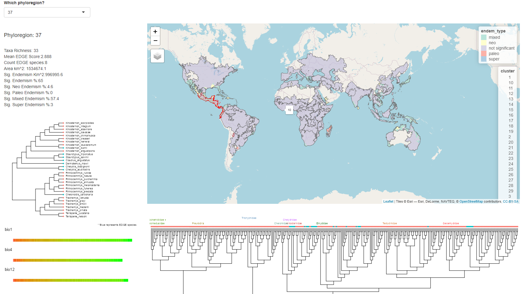 This visualization has been the single most useful tool for understanding my results. It connects various #phylogenetic, #conservation, #bioclimatic, and #geographic data for the worlds #turtles in a single interactive page.