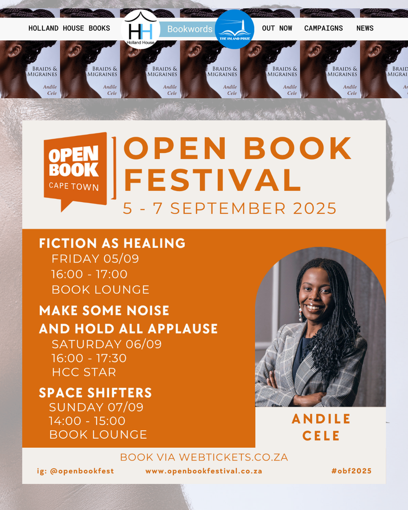A busy line-up this week for Holland House/ Island Prize author Andile Cele as she steps up to speak this Thursday online about her book 'Braids & Migraine' - before heading off to join fellow panellists at the Open Book Festival -