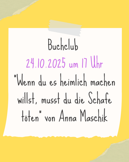 Komm vorbei, wenn du mit uns lachen, diskutieren und über Gedanken & Gefühle sprechen möchtest. Vielleicht hast du auch Lust, im Anschluss an unser Buchgespräch eigene Texte und Ideen zu teilen? Wir wollen einen sicheren Raum schaffen, in dem das möglich ist.