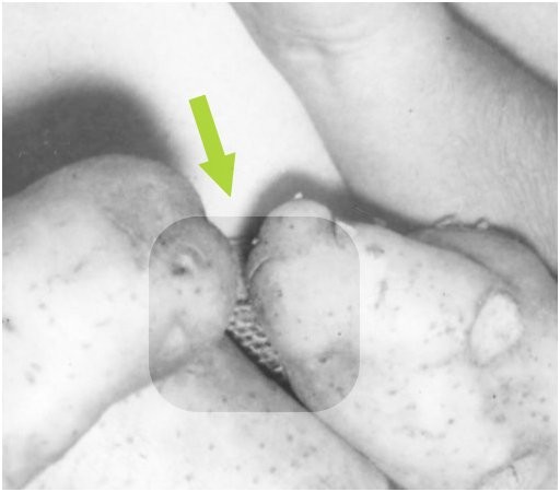Post updated today. Previously I speculated based on a detail from the meme photo that our spudly heroine was wearing a gunny sack dress or draped in burlap potato sacks. After hitting "post" late last night I noticed that the higher-resolution pic from the San Diego archives showed a confirming clear image of burlap-weave fabric between and under the potatoes: