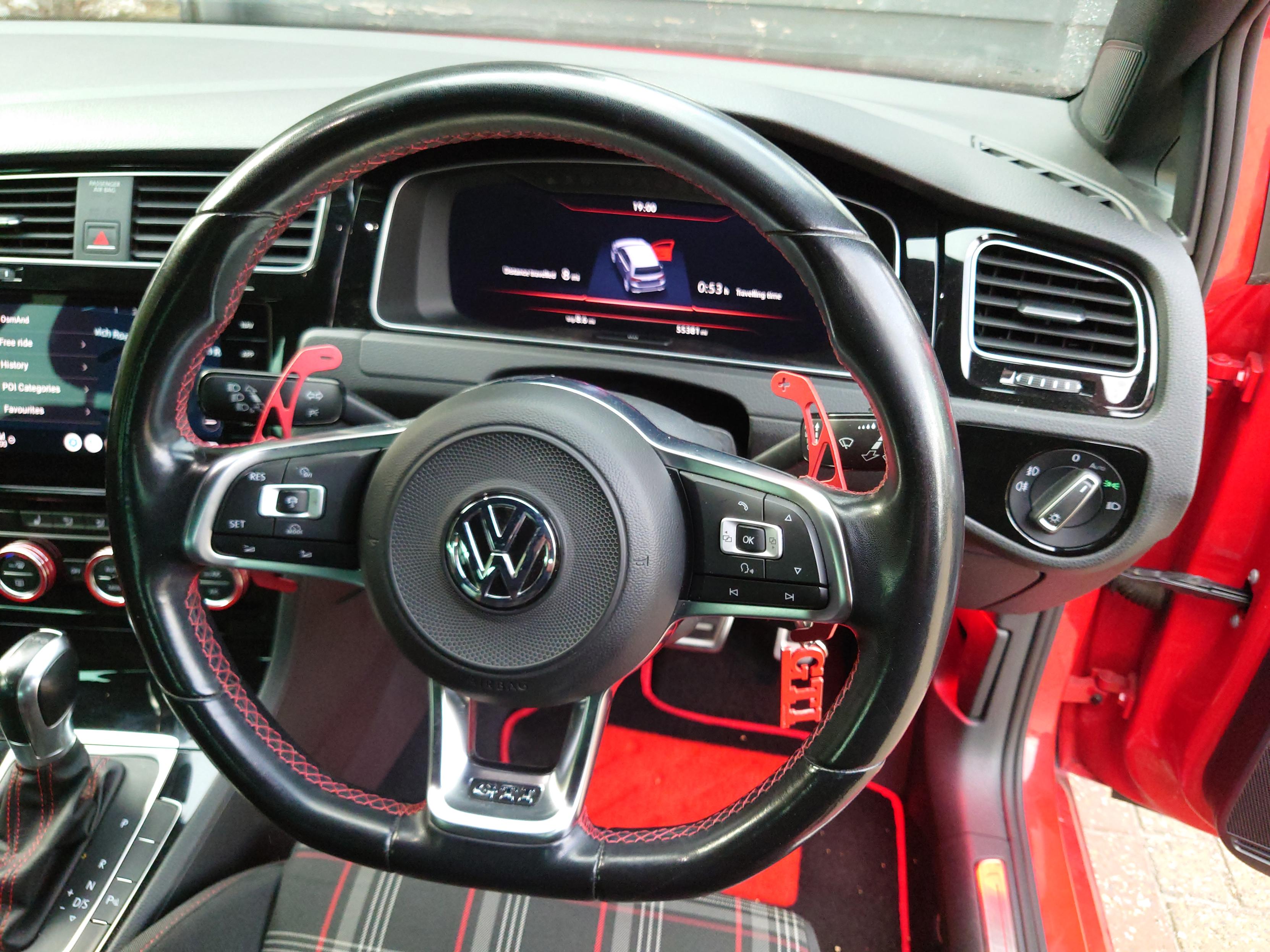 Also added red aluminium #DSG paddle shifters (replacing the stubby ones that #VW supply as stock), and selector knob with red #GTI pattern stripes. Got a thinner set of needle nose #pliers with serrated edges to yoink out plastic pins in steering wheel that hold the shifters - all the others I had were too wide by about 2mm.