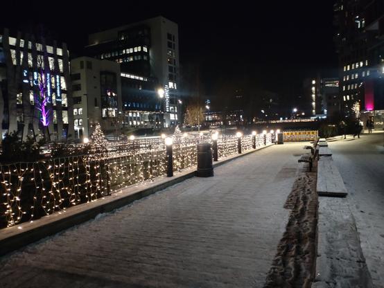 Juelysene på plass langs Akerselva ved Nydalen stasjon på t-banen, Oslo, 4. desember 2023