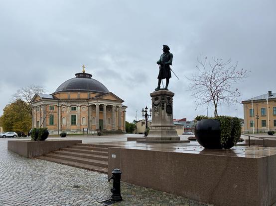 Stortorget med kung Karl XI, Trefaldighetskyrkan och en bit av Rådhuset.
