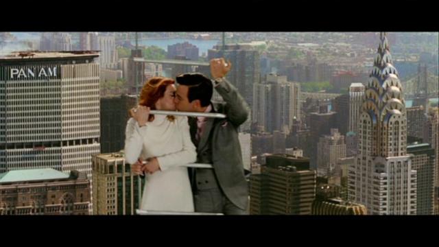 Barbara y Catcher compartiendo un momento romántico en las alturas de Nueva York, encapsulando la tensión de su relación.La tensión entre Barbara y Catcher es palpable desde el primer momento. Él representa todo lo que ella dice despreciar, pero la atracción es innegable.